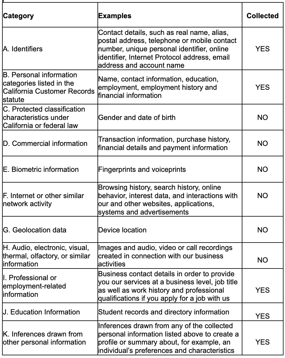 We have collected the following categories of personal information in the past twelve (12) months: